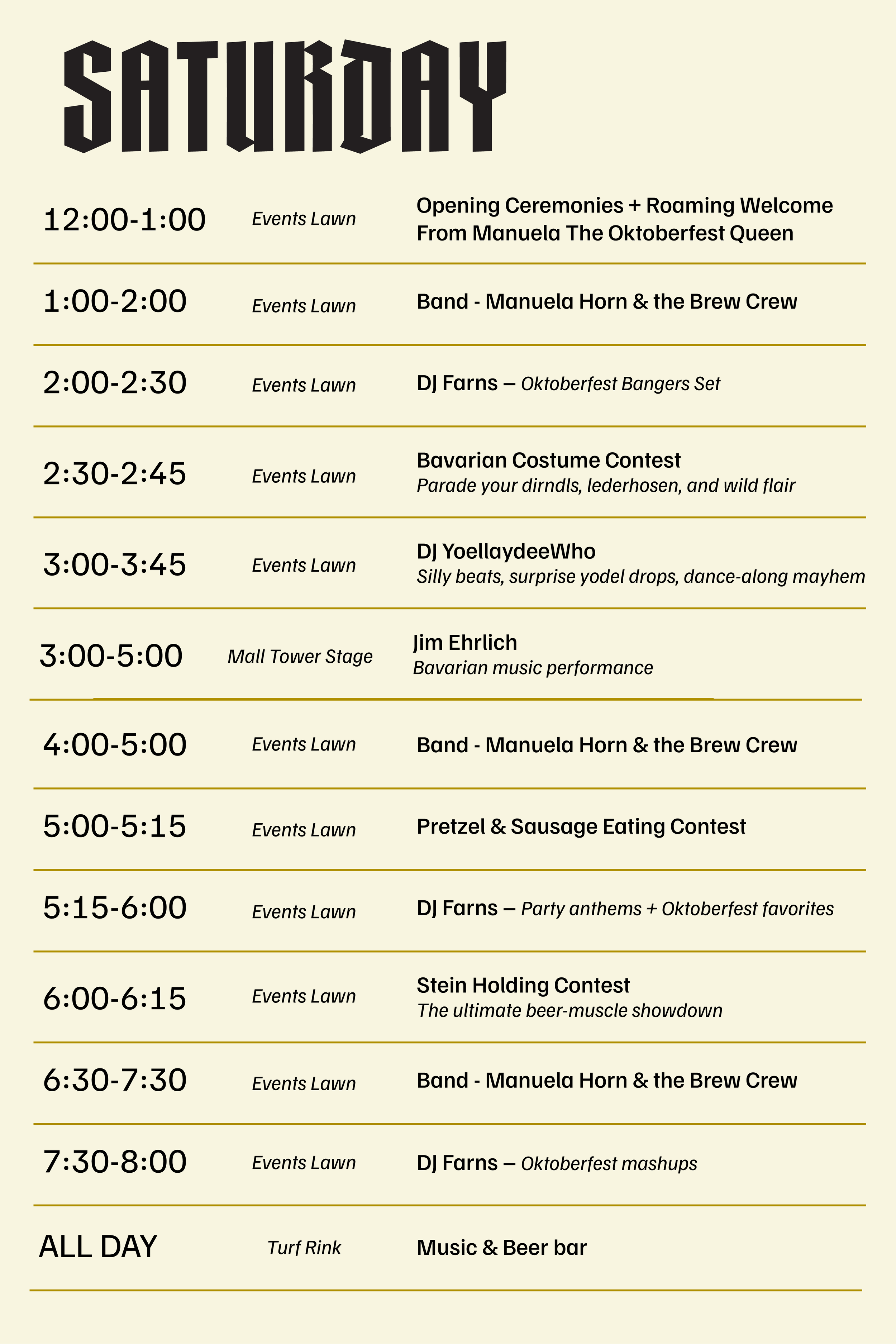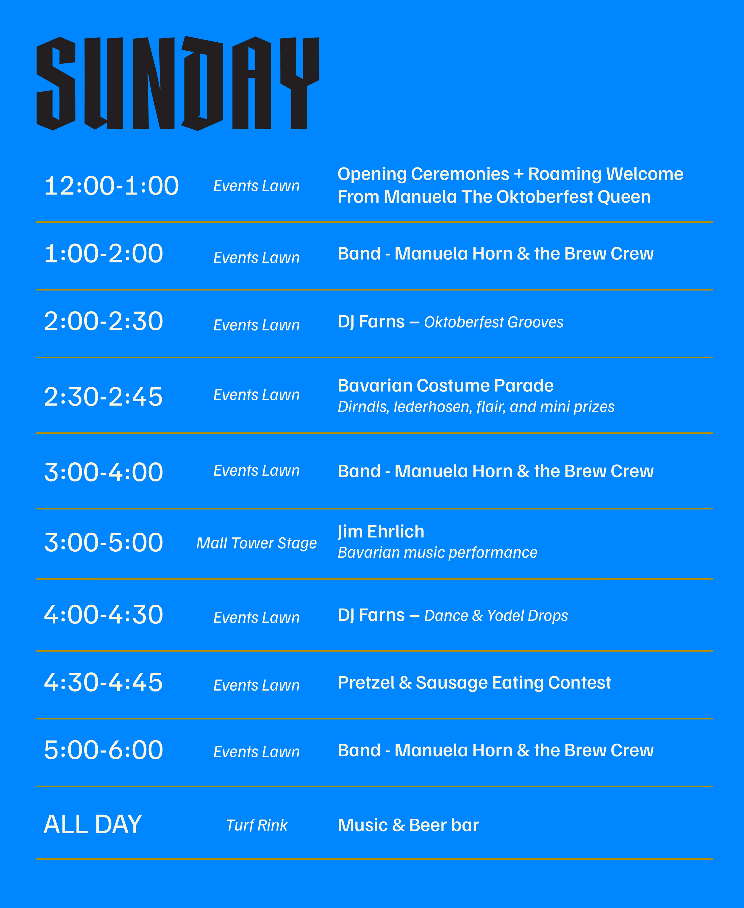 The OKTOBERFEST QUEEN and her band, The Brew Crew, will lead us for two full days of fun...